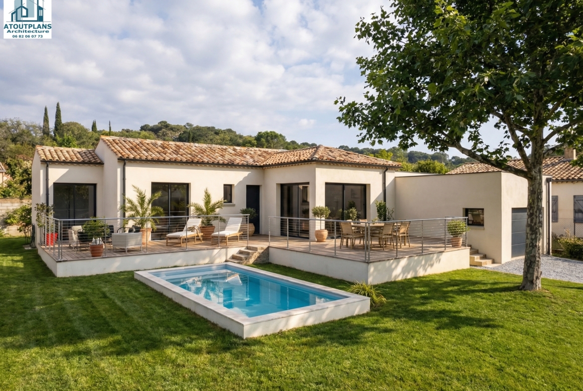 Dans ce projet de maison individuelle de 90 m² avec un garage de 60 m² et une piscine, l’enjeu principal n’était pas esthétique, mais bien technique : le terrain était traversé par deux zones de ruissellement. Autrement dit, certaines zones du terrain étaient tout simplement inconstructibles.