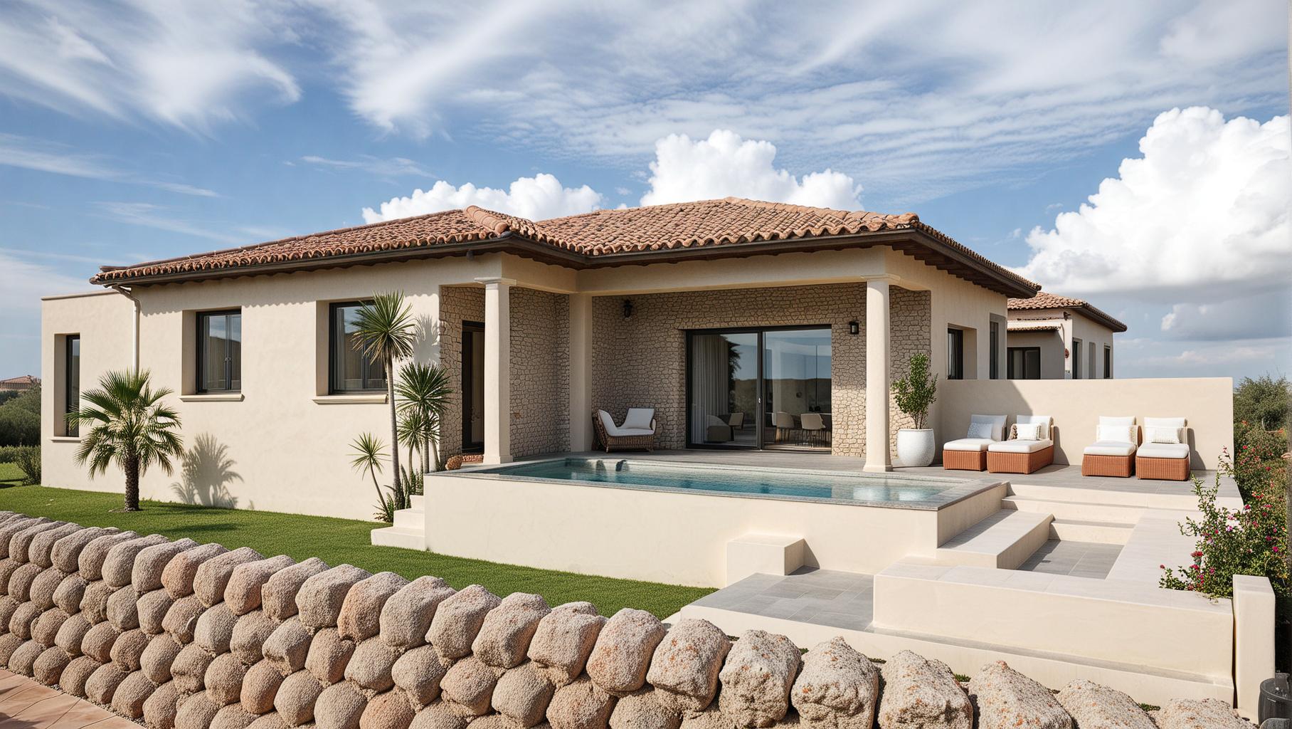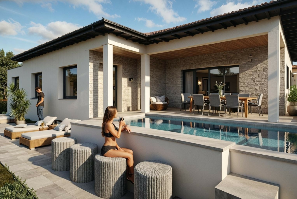 Dès le premier regard, la maison séduit par son style inspiré de l’architecture traditionnelle du sud de la France. Toiture en tuiles, façades claires, touches de pierre naturelle… tout a été pensé pour s’intégrer harmonieusement dans le paysage environnant, avec en toile de fond les vignes.